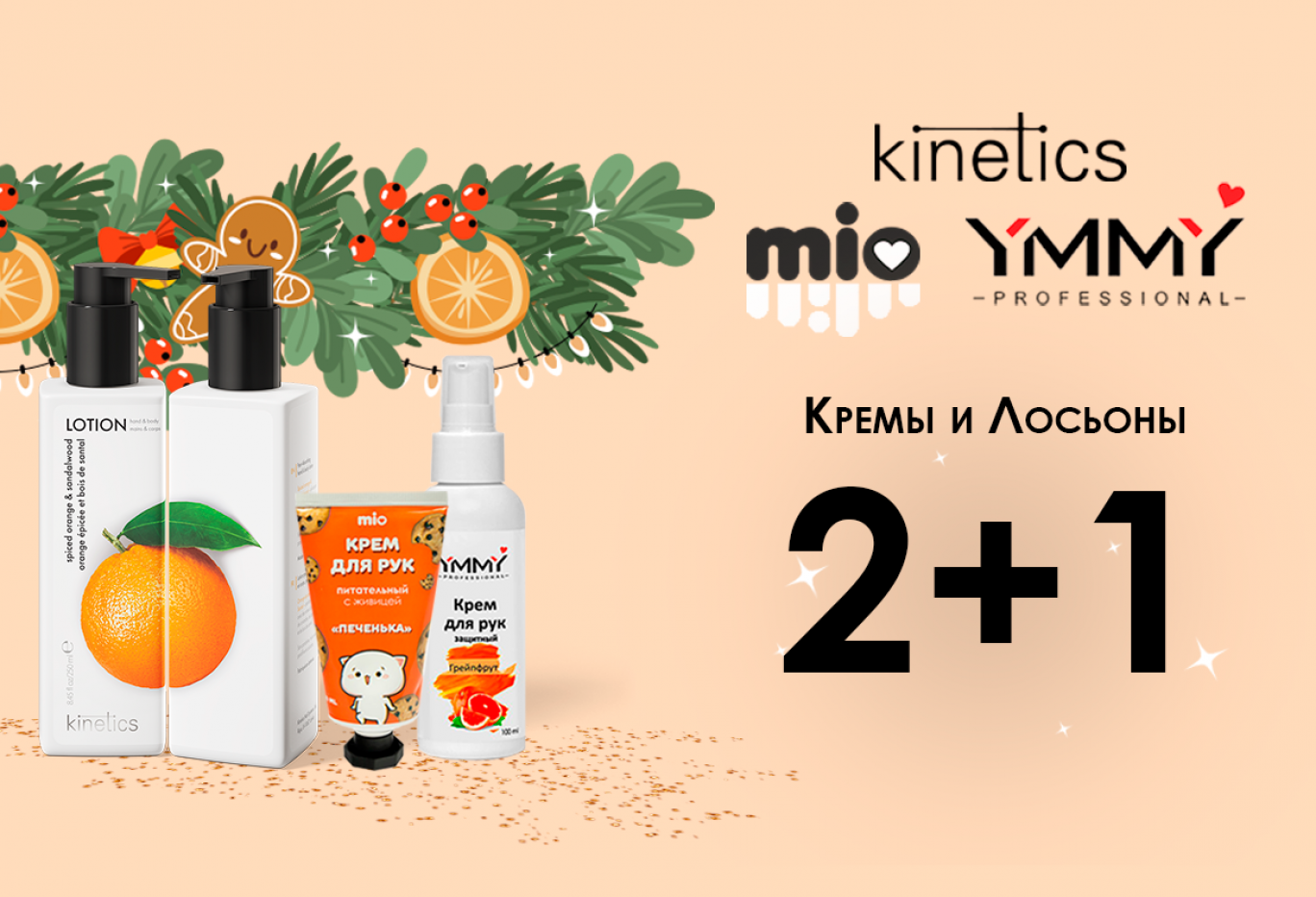 Весь декабрь при покупке двух кремов для рук MIO, YMMY Professional или лосьонов для рук и тела Kinetics третий того же бренда в подарок!