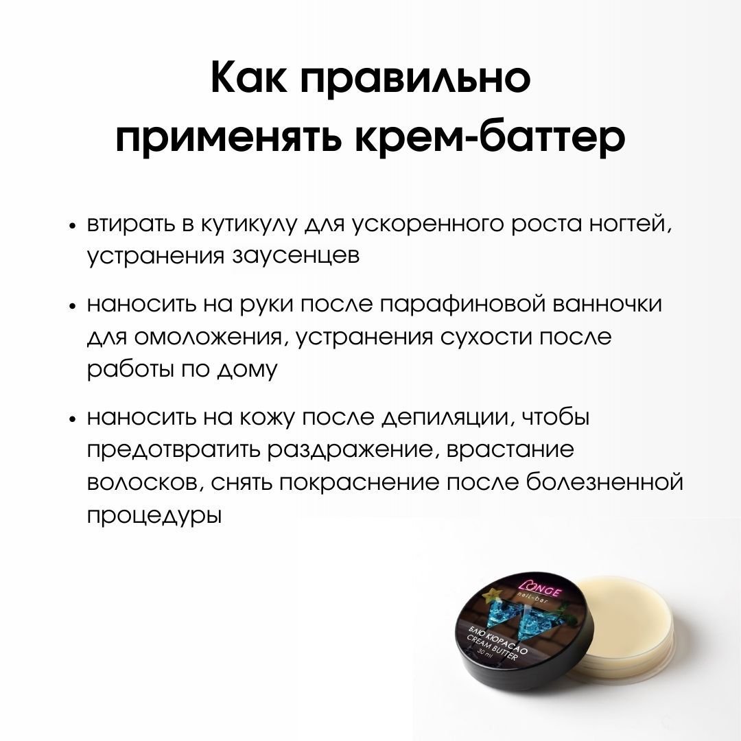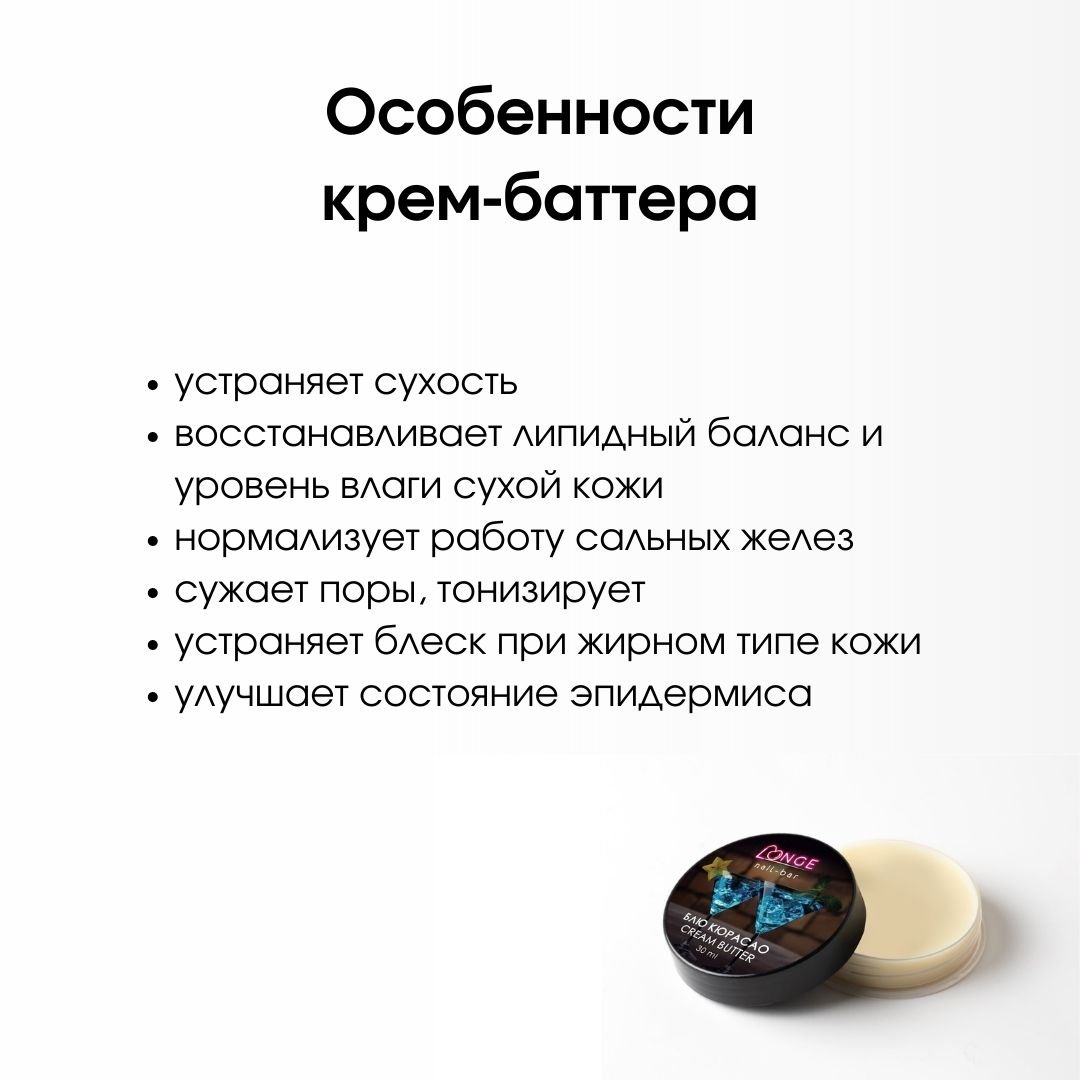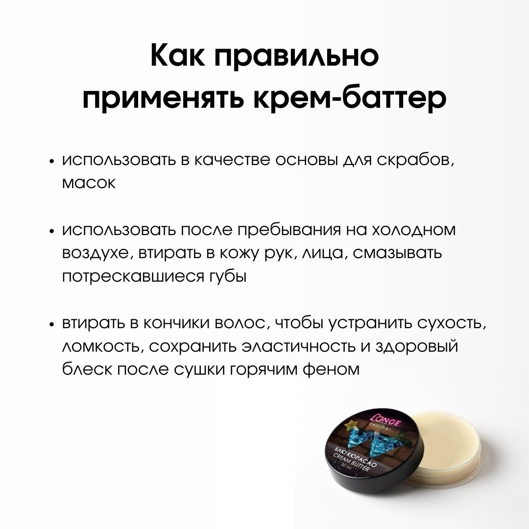 Крем-баттер – это отличный питательный и увлажняющий продукт, который сделает вашу кожу нежной и бархатистой на ощупь. Он состоит из сочетания нескольких масел и обладает очень необычной консистенцией – он твердый, маслянистый и плотный в баночке, но тает при соприкосновении с кожей, образуя защитный барьер. Состав продукта максимально безопасный, благодаря чему он не забивает поры. Высокая концентрация натурального масла Ши помогает повышать упругость, способствует регенерации сухой, потрескавшейся и проблемной кожи. Не вызывает никаких раздражений.