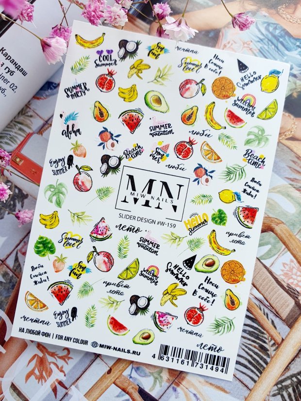 Современный материал для декорирования ногтей под лак, гель-лак, гель или акрил. Материал представляет собой тончайшую прозрачную пленку с изображением элементов дизайна на бумажной подложке. Посредством размачивания в воде пленка легко снимается с подложки и ложится на ноготь, отлично повторяя его форму.