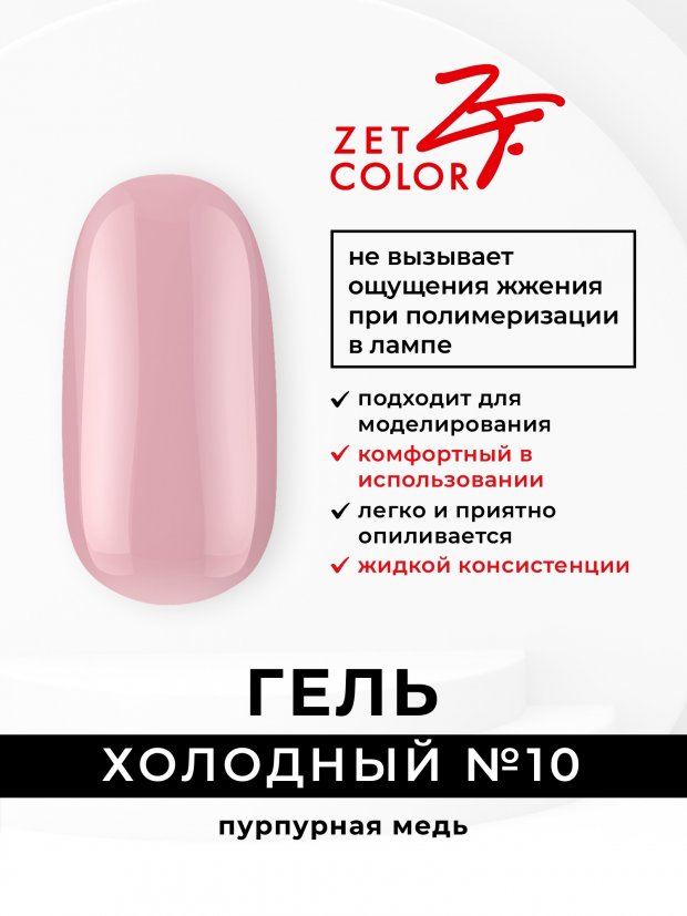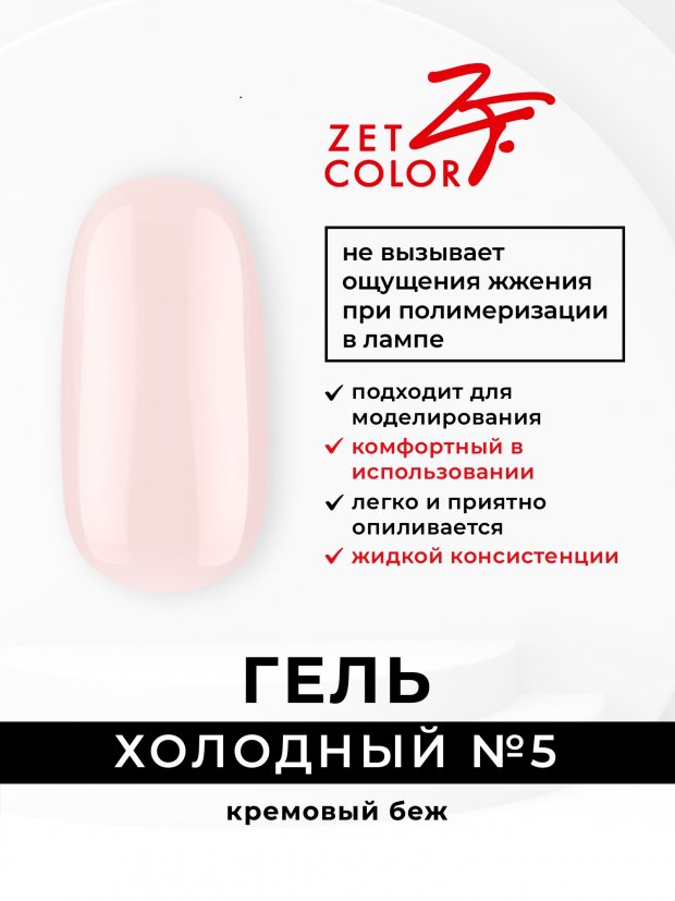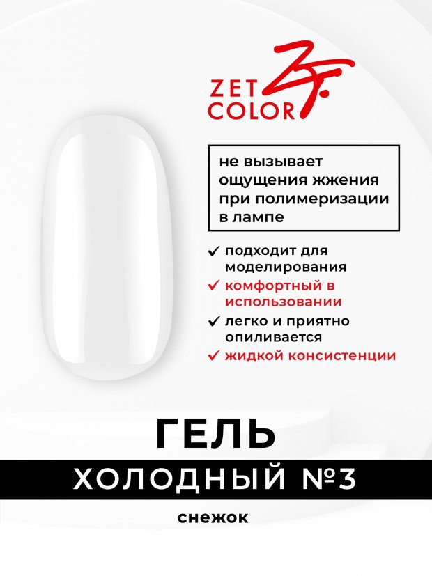 Гель для моделирования "Холодный гель" от Zet Color - Комфортный в использовании гель для моделирования и укрепления ногтей. - Не вызывает неприятного жжения при полимеризации в лампе - Наносится на базовое покрытие - Легко опиливается без пыли и затруднений